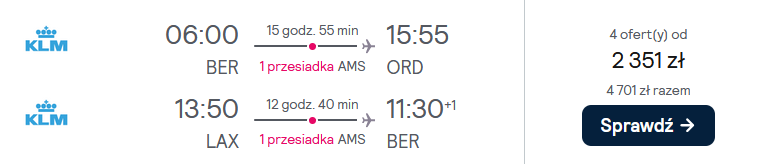 Do Ameryki udasz się w terminie 18 marca-3 kwietnia. Twój wyjazd rozpocznie się i zakończy na lotnisku Berlin Brandenburg. Pierwszym jej etapem będzie lot do Chicago. Powrót do Niemiec zaplanowałem z lotniska w Los Angeles. W obie strony polecisz linią KLM z przesiadką w Amsterdamie. W cenę biletu wliczono bagaż podręczny i przedmiot osobisty.