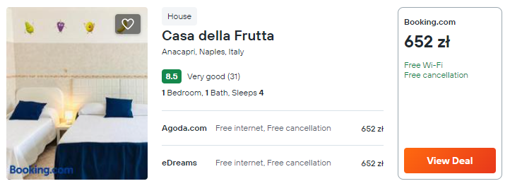 Na Capri rozważ zakwaterowanie w bardzo dobrze ocenianym Casa della Frutta. Czeka tam w pełni wyposażony domek wakacyjny.