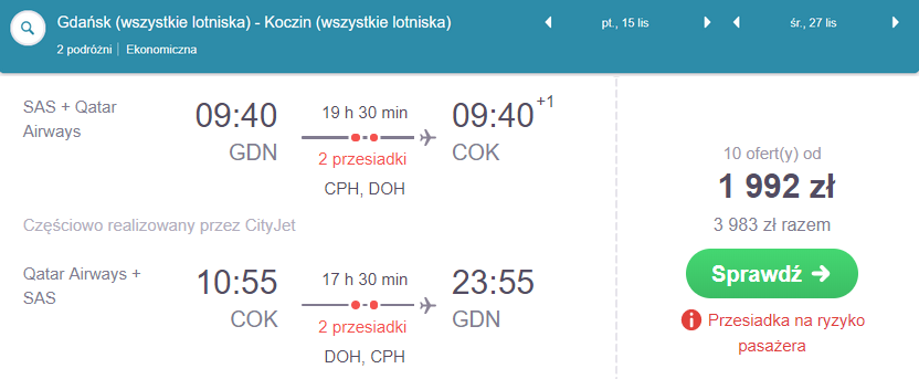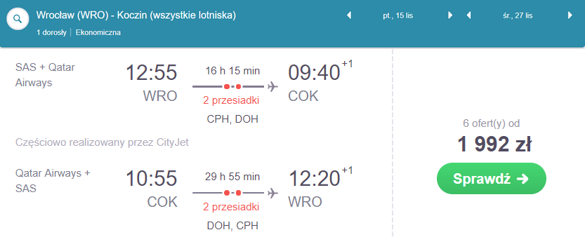 Rzadko kiedy mamy okazję informować was o dobrych ofertach na piękne południe Indii. Ta oferta jest tym bardziej atrakcyjna, że loty odbędziecie na pokładzie świetnego przewoźnika – Qatar Airways. Po drodze czekają was dwie przesiadki. Jedna w Kopenhadze, a kolejna w stolicy Kataru (można ją wykorzystać na zwiedzanie miast). Stan Kerala to zjawiskowa przyroda, niezwykle ciekawa i bogata kultura oraz piękne plaże. Główną atrakcją tego regionu są wielkie rozlewiska – Kerala Backwaters. Szczegółowe informacje znajdziecie tutaj.