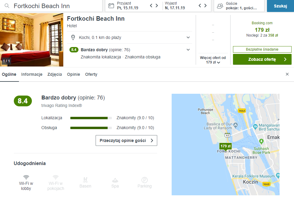 Proponuję wam zakwaterowanie w najstarszej, a zarazem najładniejszej części miasta – Forcie Koczin. Bardzo dobrze oceniany hotel udostępnia swoim gościom przestronnie, gustownie urządzone pokoje. Na miejscu funkcjonuje restauracja, w której możecie zakosztować przepysznej indyjskiej kuchni. Cena zawiera codziennie śniadanie.