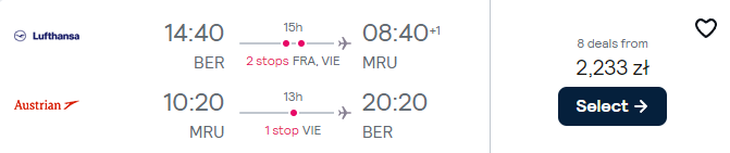 Do Afryki udasz się w okresie między marcem a kwietniem przyszłego roku. Na Mauritius polecisz z Berlina linią Austrian Airlines / Lufthansa z przesiadkami w Austrii i/lub na terenie Niemiec.