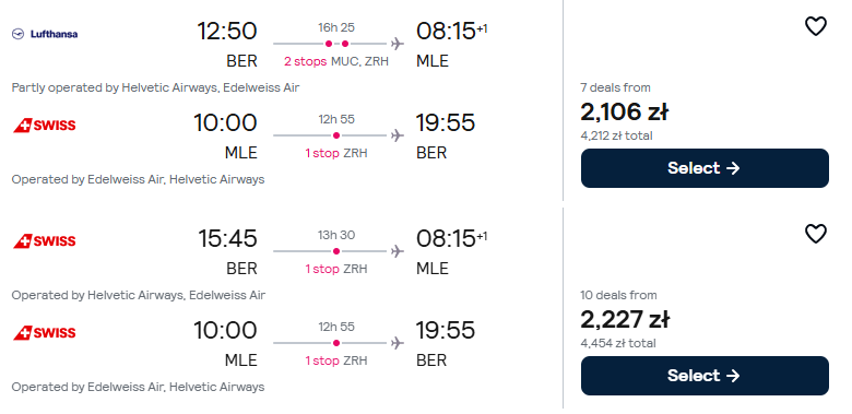 Na Malediwy (do Male) wybierzesz się w terminie 11(12) – 19 maja. Czeka cię lot z Berlina, w zależności od wybranej opcji z przesiadkami w Zurychu i Monachium.