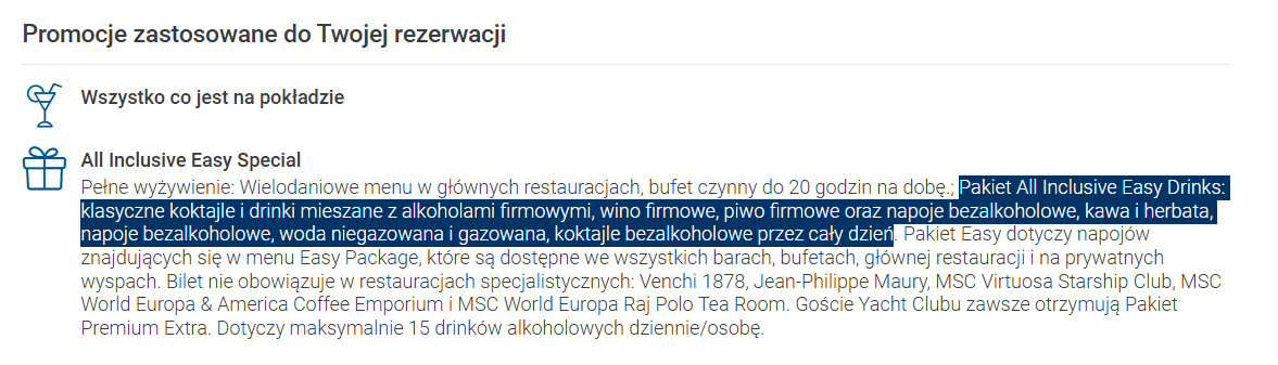 Ważne! Na prywatnej wyspie MSC (Ocean Cay) w lokalnych restauracjach zapewnione będziesz miał wyżywienie, a osoby z wykupionymi pakietem (tak, to właśnie ty!) bezpłatnie zamawiać mogą napoje bezalkoholowe jak i alkoholowe.