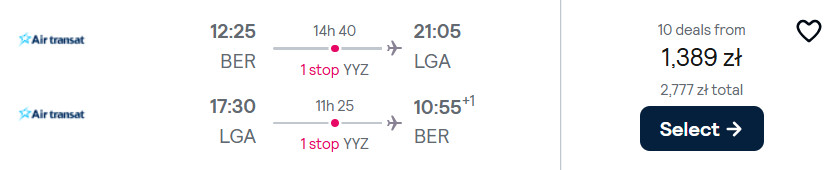 Do Nowego Jorku polecisz z Berlina, w terminie 26 września-9 października linią Air Transat z przesiadkami w Toronto. Do USA udasz się z bagażem podręcznym oraz przedmiotem osobistym.