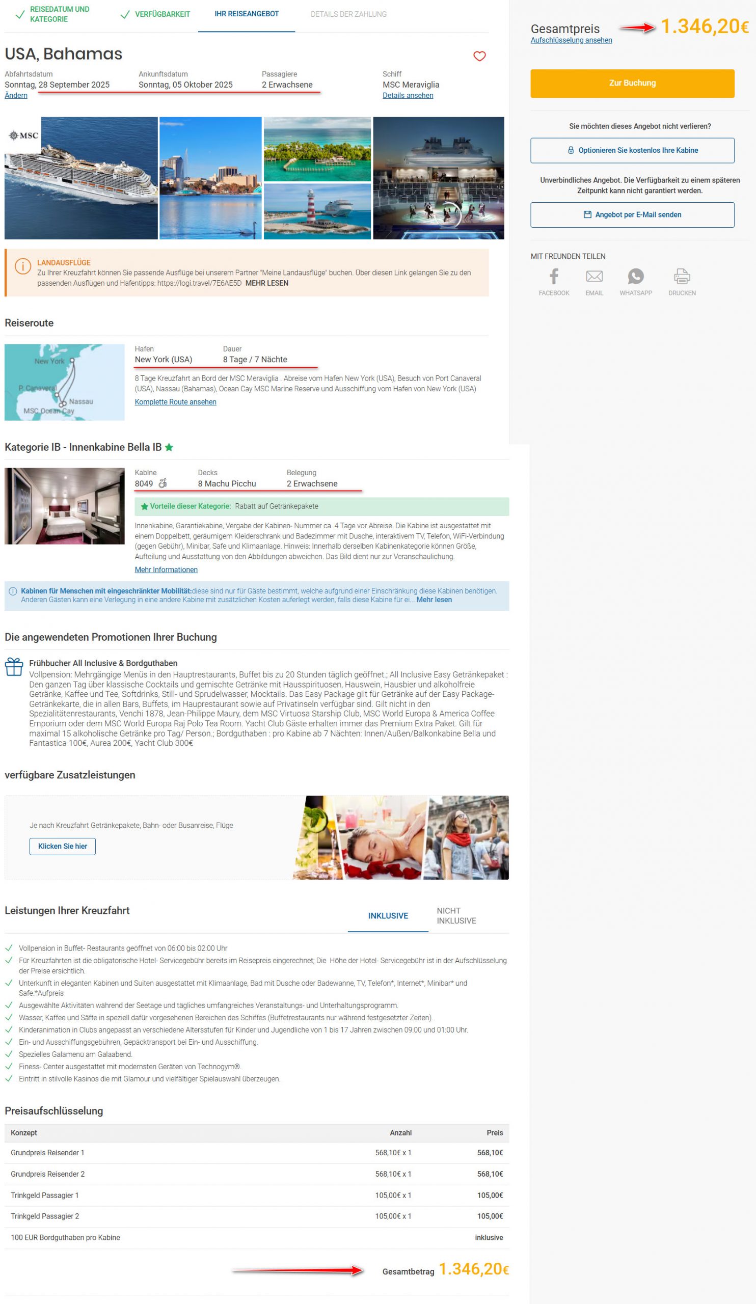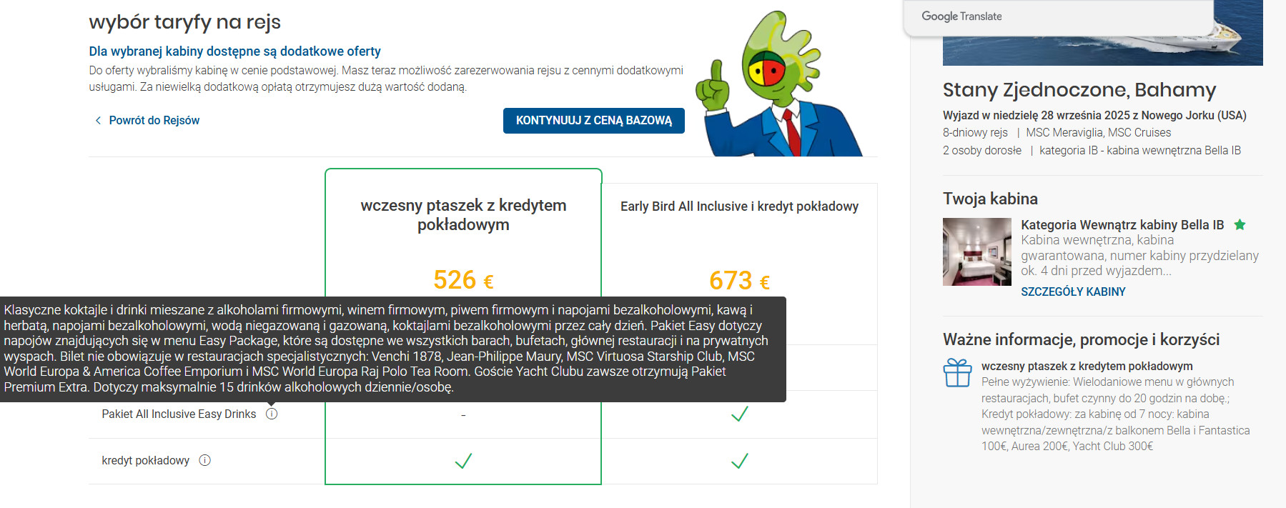 Za rejs w terminie 28 września-5 października statkiem MSC Meraviglia zapłacisz 1346,2 EUR/2 osoby (ok. 5582 PLN/2 osoby – ok. 2791 PLN/osoba). W cenę wliczone jest zakwaterowanie w 2-osobowej kajucie bez okna z łazienką, opłaty portowe, napiwki oraz All Inclusive Easy Special, czyli wszystkie ciepłe napoje, soki, napoje bezalkholowe jak i alkoholowe zamawiane w barach oraz restauracjach do 6 EUR/sztuka – są bezpłatne w ilości 15 drinków/osoba/dzień. W cenę wliczone są posiłki serwowane w godzinach 6:00-2:00. Restauracje bufetowe są czynne do godziny 20:00.