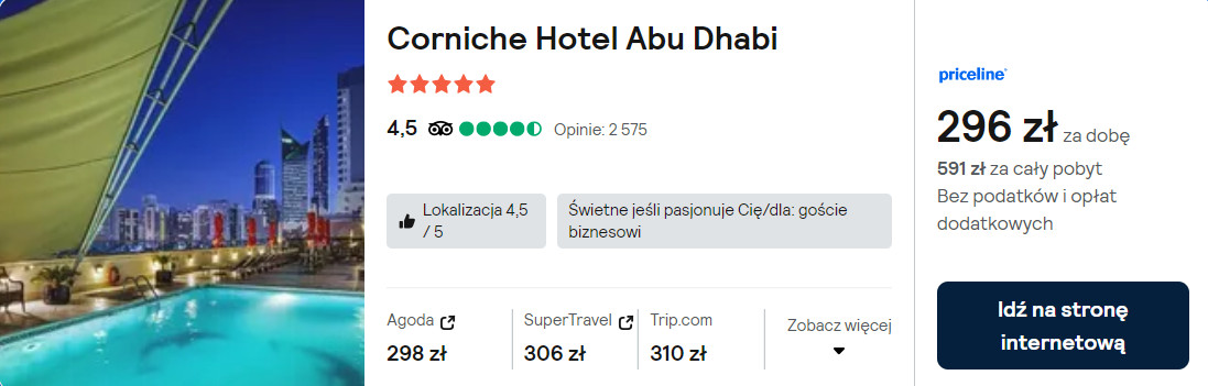 Jesteś w stanie wydać nieco więcej na zakwaterowanie? W takim razie postaw na pobyt w 5* hotelu Corniche Hotel Abu Dhabi, który znajduje się w odległości 15 minut spokojnego spaceru od plaży. Wszystkie pokoje są klimatyzowane i wyposażone w telewizor LCD, minibar oraz zestaw do parzenia kawy i herbaty.