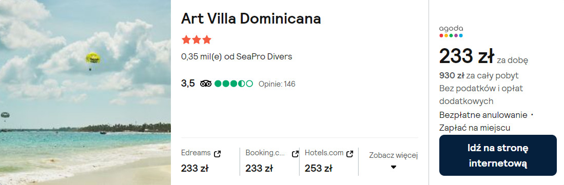 Natomiast w Dominikanie proponuję wam noclegi z codziennymi śniadaniami w 3* hotelu Art Villa Dominicana, który mieści się nieopodal plaży w kurorcie Bavaro. W każdym pokoju jest łazienka z prysznicem. Na terenie całego obiektu będziesz mieć zapewniony dostęp do sieci WiFi.