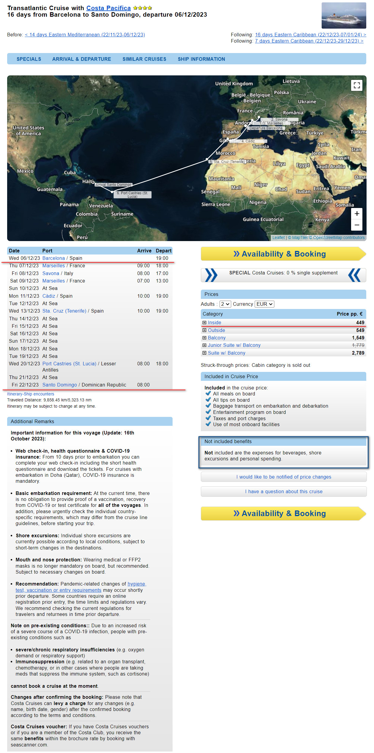 Za 16-dniowy rejs (6-22 grudnia) statkiem Costa Pacifica z Barcelony do Santo Domingo (dla dwóch osób) zapłacisz tylko 898 EUR (ok. 4014 PLN – 2007 PLN/osoba). W cenę wliczone jest zakwaterowanie w 2-osobowej kajucie z łazienką, bez okna (kabina wewnętrzna), opłaty portowe, napiwki oraz wyżywienie.