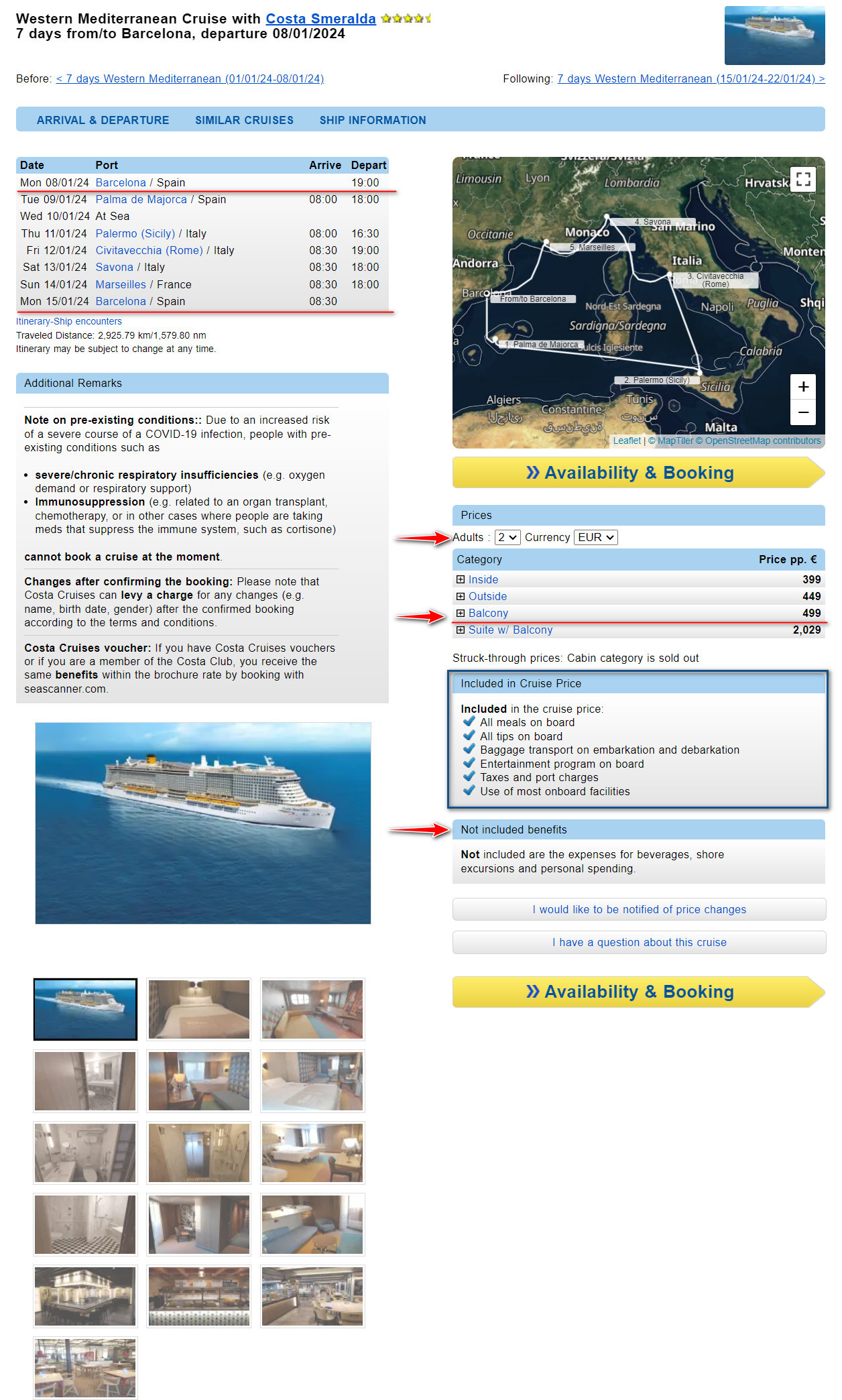 W cenę przygotowanego przeze mnie pakietu wliczony jest 7-dniowy rejs wycieczkowcem Costa Smeralda po basenie Morza Śródziemnego. Statek wypływa i wraca do portu w Barcelonie. Więcej informacji znajdziesz poniżej w tekście. Wskazówka! Jak dojechać do danego portu dowiesz się z tej strony internetowej whatsinport.com.