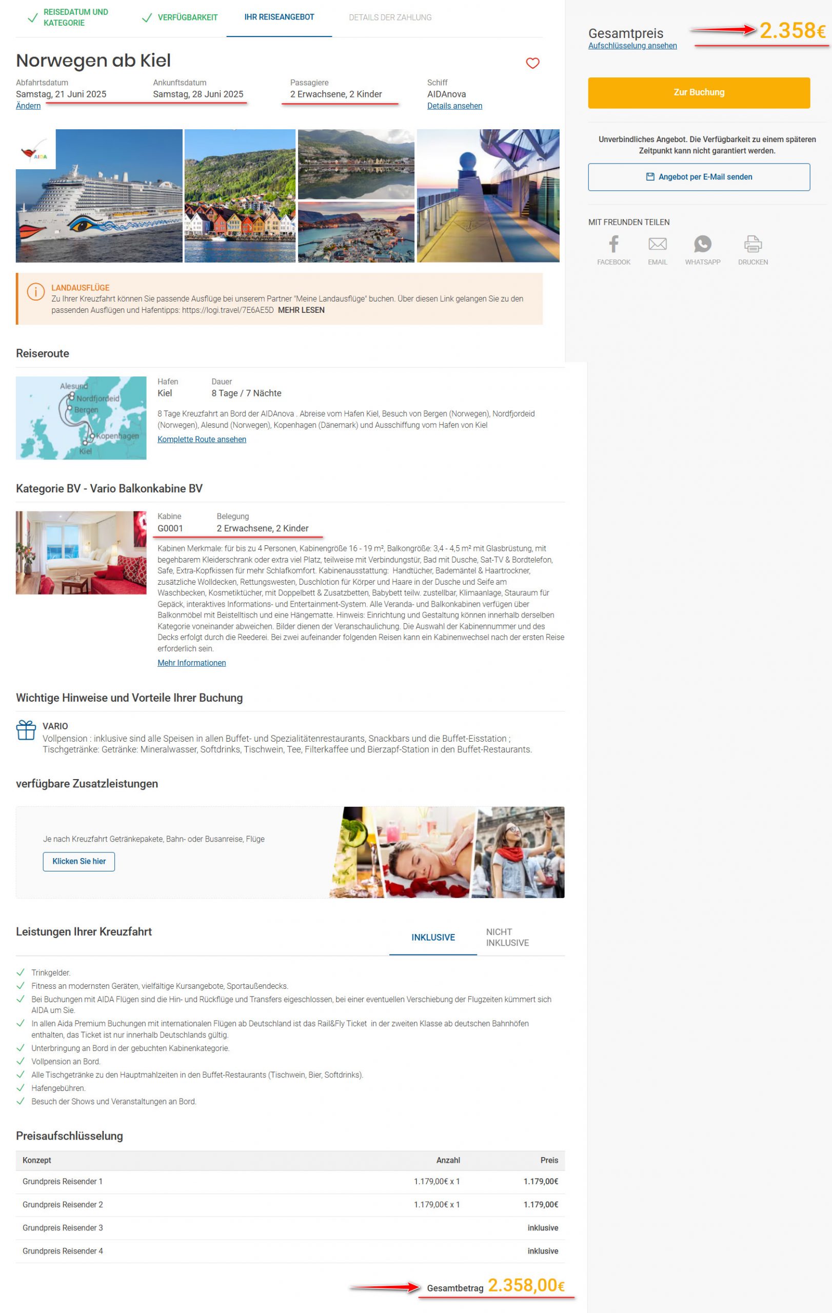 Rejs w terminie 21-28 czerwca statkiem AIDAnova kosztować twoją rodzinę będzie 2358 EUR (ok. 10069 PLN/4 osoby, czyli ok. 2517 PLN/osoba). W tę cenę wliczone jest zakwaterowanie w 4-osobowej kajucie z balkonem i łazienką, opłaty portowe, napiwki oraz all inclusive w restauracjach bufetowych. Woda, kawa, soki oraz napoje gazowane (cola, fanta, sprite, cola light) dostępne są cały czas. Piwo oraz wino serwowane jest w godzinach 12:00-14:30 oraz od 17:00 do 21:30.