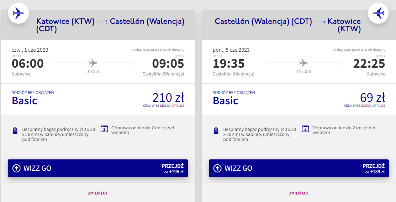 Do Castellon de la Plana udasz się z katowickiego lotniska w Pyrzowicach w terminie 1-5 czerwca (czwartek-poniedziałek). W obie strony polecisz na pokładzie samolotów linii Wizz Air z wliczonym małym bagażem podręcznym. Bilety w najniższej cenie dostępne są dla osób z Wizz Discount Club. Chętni na loty bez WDC zapłacą więcej.
