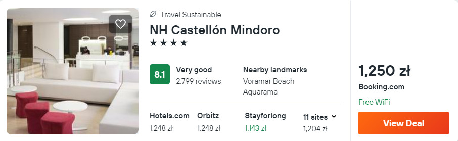 Na miejscu zatrzymasz się w bardzo dobrym 4* hotelu NH Castellón Mindoro, który znajduje się w ścisłym centrum miasta. Z lotniska Castellon w okolice głównego dworca dojedziesz dedykowanym autobusem. Wszystkie kursy są zsynchronizowane z odlotami i przylotami.