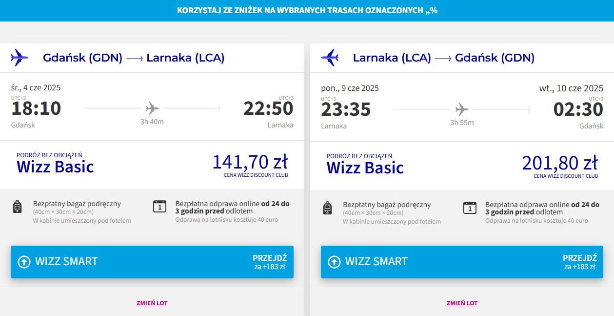 Na Cypr polecisz z Gdańska w terminie 4-9 czerwca (środa-poniedziałek) linią Wizz Air. Pamiętaj, że bilety w najniższej cenie dostępne są dla członków Wizz Discount Club. Chętni na loty bez WDC zapłacą nieco więcej – szczegóły poniżej.
