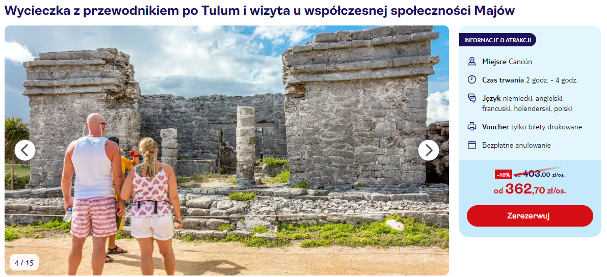 Wycieczka do Meksyku zaplanowana została w terminie 16 – 23 listopada. Czeka cię bezpośredni lot z Poznania do Cancun, realizowany na pokładzie samolotu Boeing 787 Dreamliner w barwach PLL LOT. W cenę wliczono podróż z bagażem rejestrowanym (nadawanym do luku).