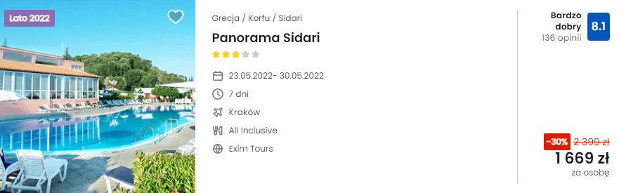 W podróż do Grecji udacie się w terminie 23–30 maja. Czeka was bezpośredni lot z wliczonym bagażem rejestrowanym z Krakowa lub Poznania na Korfu. Na miejscu będziecie zakwaterowani w 3* hotelu Panorama Sidari. Do waszej dyspozycji będzie basen zewnętrzny i komfortowe wyżywienie all inclusive.