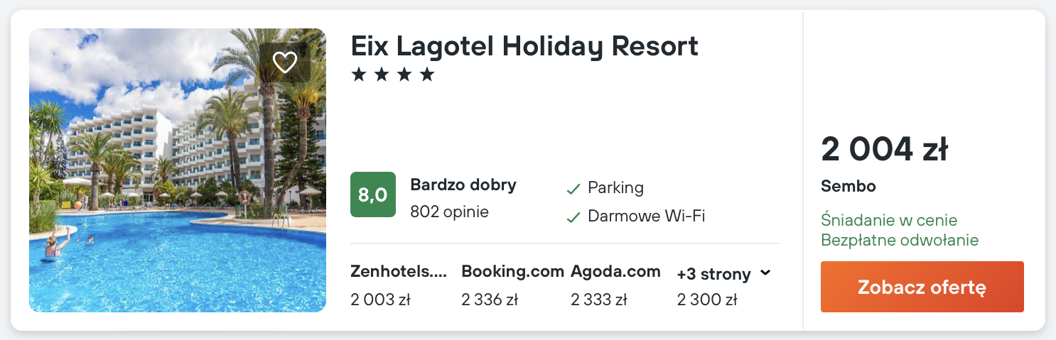 Na Majorce polecam noclegi w 4* Eix Lagotel Holiday Resort. W cenę zakwaterowania wliczone są śniadania.