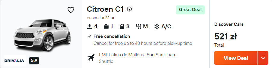 Po przylocie na Majorkę wypożycz samochód. Mając do swojej dyspozycji auto, łatwo i wygodnie dojedziesz do miejsca zakwaterowania, na przylądek Formentor, do Portu de Sóller oraz w różne inne, ciekawe rejony wyspy.