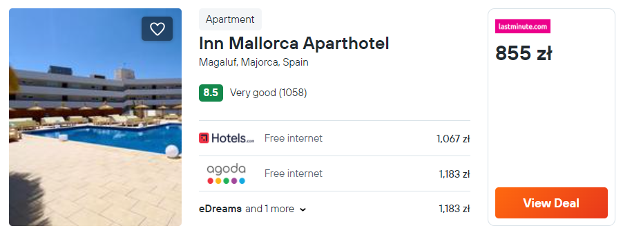 Na Majorce zatrzymasz się w kompleksie Inn Mallorca Aparthotel, który znajduje się w miejscowości Magaluf. Z lotniska w okolice miejsca noclegowego dojedziesz komunikacją miejską lub wypożyczonym samochodem.