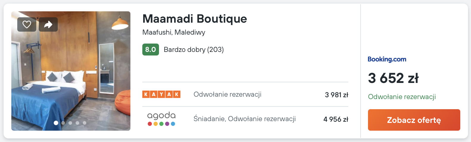 Na Malediwach zatrzymasz się w hotelu Maamadi Boutique, który położony jest na wyspie Maafushi. Obiekt znajduje się przy plaży. W cenę noclegów wliczone są śniadania, obiady i kolacje. Z lotniska dostaniesz się tam łodzią w cenie około 207 PLN w obie strony.