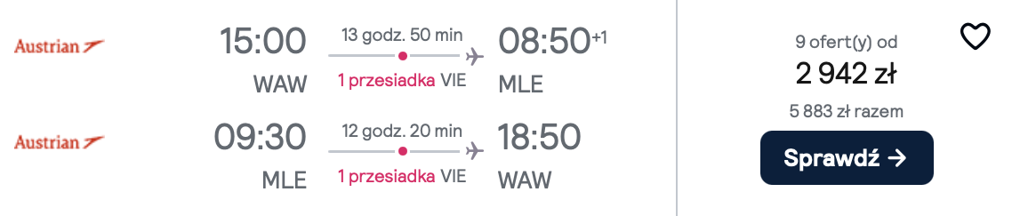 Do Azji wybierzesz się w terminie 16(17)-30 marca z lotniska im. Fryderyka Chopina w Warszawie. Na Malediwy polecisz linią Austrian Airlines z przesiadką w Wiedniu. W cenę biletu wliczony jest bagaż podręczny.