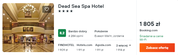 Rekomenduję postawić na noclegi w świetnym 4* hotelu Dead Sea Spa. Będzie to bardzo dobra baza wypadowa dla twoich wycieczek oraz idealne miejsce na relaks. Na początek dnia otrzymasz śniadanie wliczone w cenę zakwaterowania.