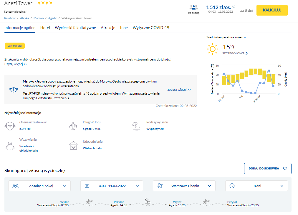 Urlop w Maroku zaplanowano w terminie 4 – 11 marca, a w podróż udacie się z Warszawy lub Katowic. W cenę pakietu wliczono także bagaż rejestrowany, dlatego z pewnością nie będziecie mieli problemu ze spakowaniem walizek. Na miejscu będziecie zakwaterowani w bardzo dobrze ocenianym 4* hotelu Anezi Tower, w Agadirze – zaledwie 500 m od centrum miasta oraz 300 m od plaży. Dla gości przygotowano m.in.: komfortowe pokoje, odkryty 3 baseny, bar, bankomat oraz restaurację.