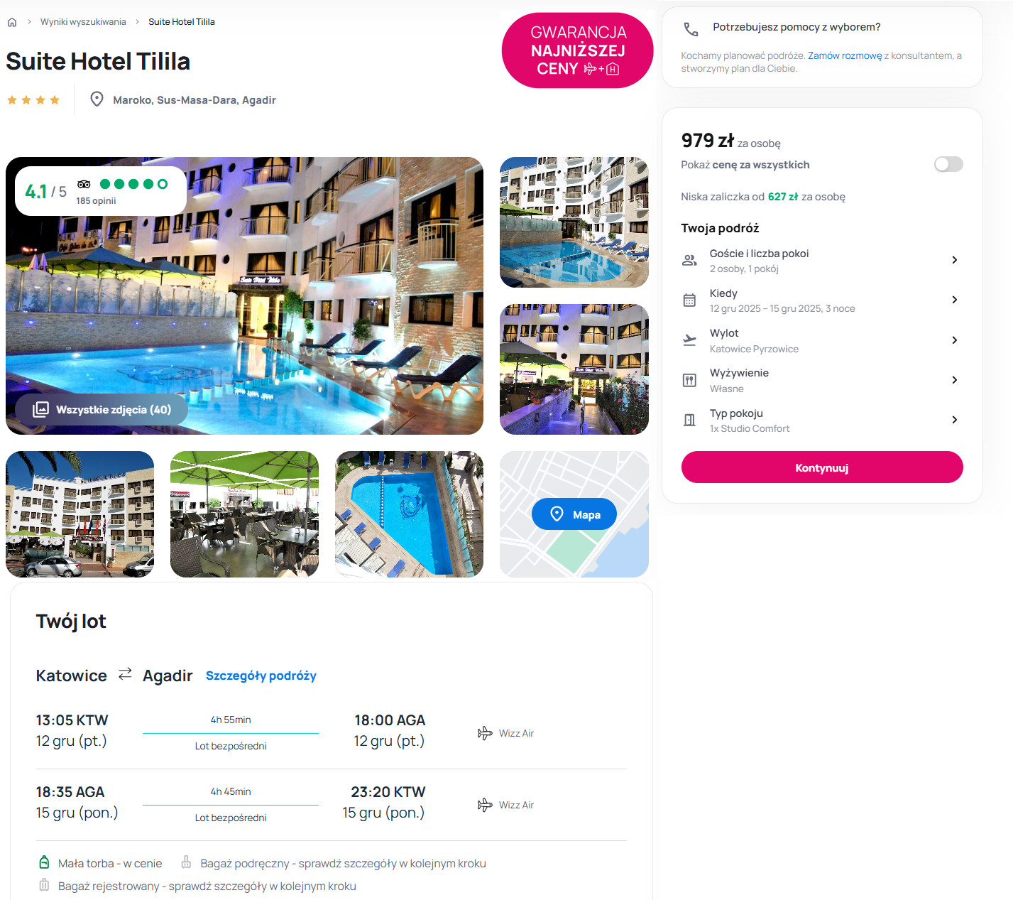 Do Maroka (Agadir) polecisz w piątek (12 grudnia) z Katowic o 13:05. W drogę powrotną wyruszysz w poniedziałek (15 grudnia), a odlot zaplanowany jest na godzinę 18:35. W obie strony podróżować będziesz linią Wizz Air z bagażem podręcznym.