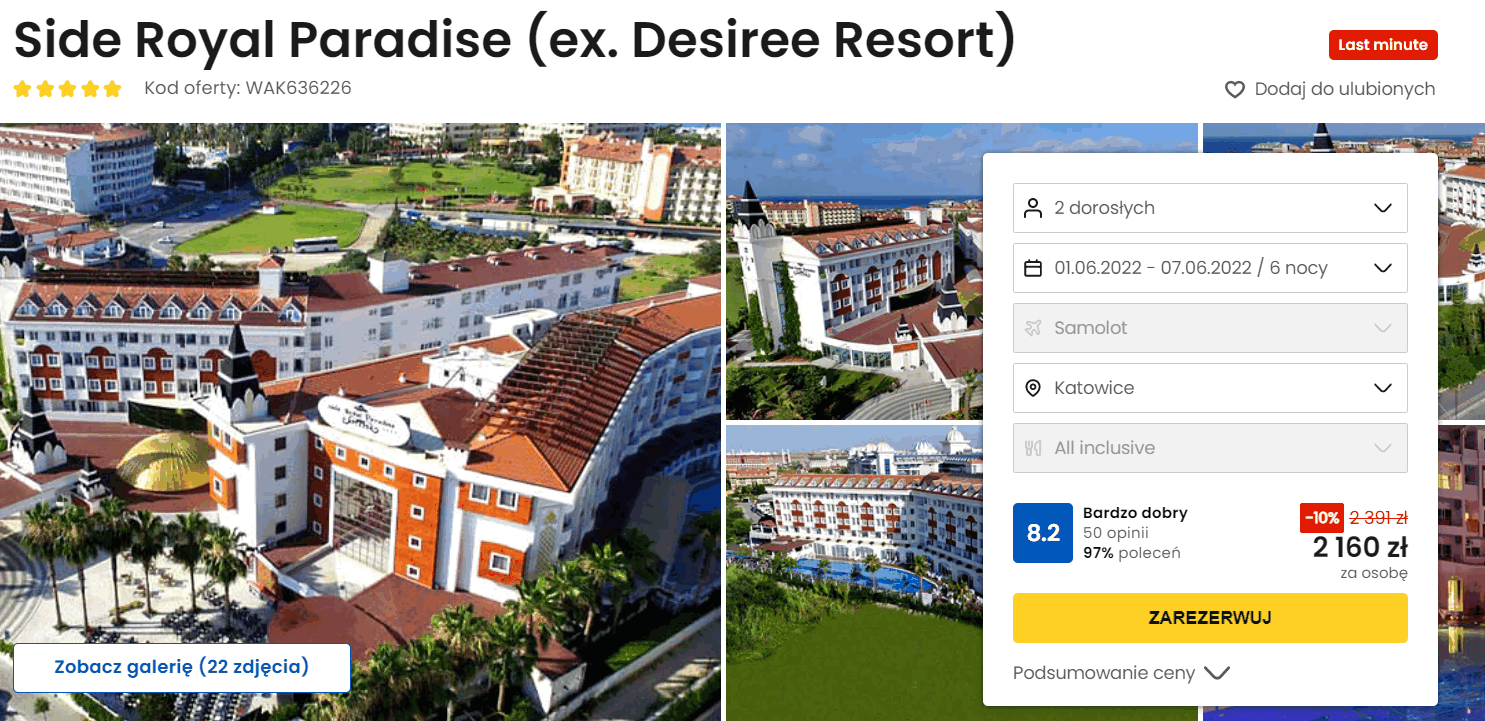 Będziecie zakwaterowani w świetnie ocenianym 5* hotelu Side Royal Paradise. Tym, co wyróżnia go spośród innych propozycji jest bardzo dobra lokalizacja, obsługa na najwyższym poziomie, zróżnicowane menu w ramach all inclusive, a także bogate zaplecze rekreacyjno-wypoczynkowe. To wszystko składa się na świetne opinie pozostawione przez dotychczasowych gości.