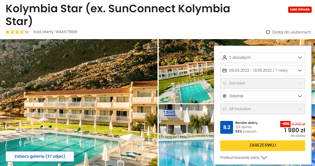 Będziecie zakwaterowani w bardzo dobrze ocenianym 4* hotelu Kolymbia Star. Lokalizacja niedaleko plaży, odkryty basen, komfortowo urządzone pokoje oraz zróżnicowana forma wyżywienia z all inclusive to najważniejsze atuty hotelu