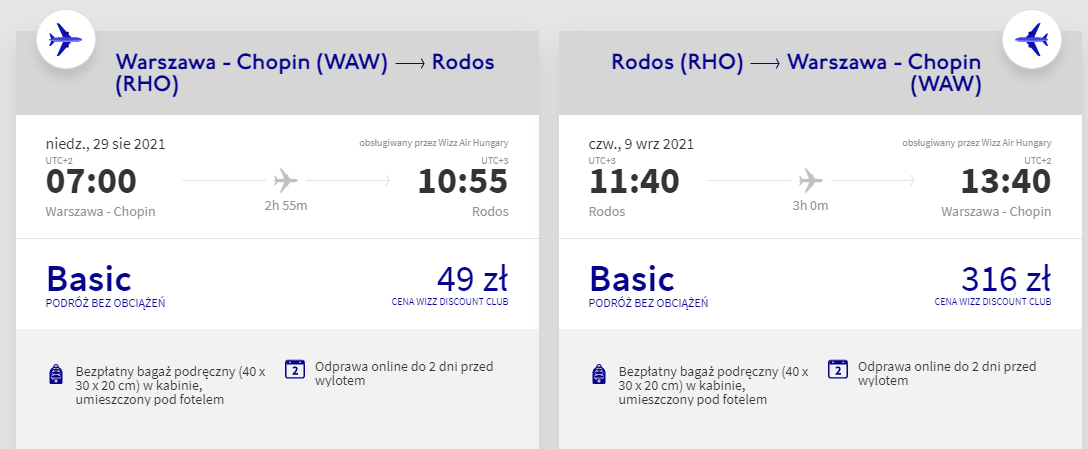 Wasza wycieczka do Grecji zaplanowana została latem, w terminie 29 sierpnia – 9 września. Czeka was bezpośredni lot z Warszawy, realizowany na pokładzie samolotu linii lotniczej Wizz Air. Pamiętajcie, że w cenę przelotu wliczony jest tylko mały bagaż podręczny.