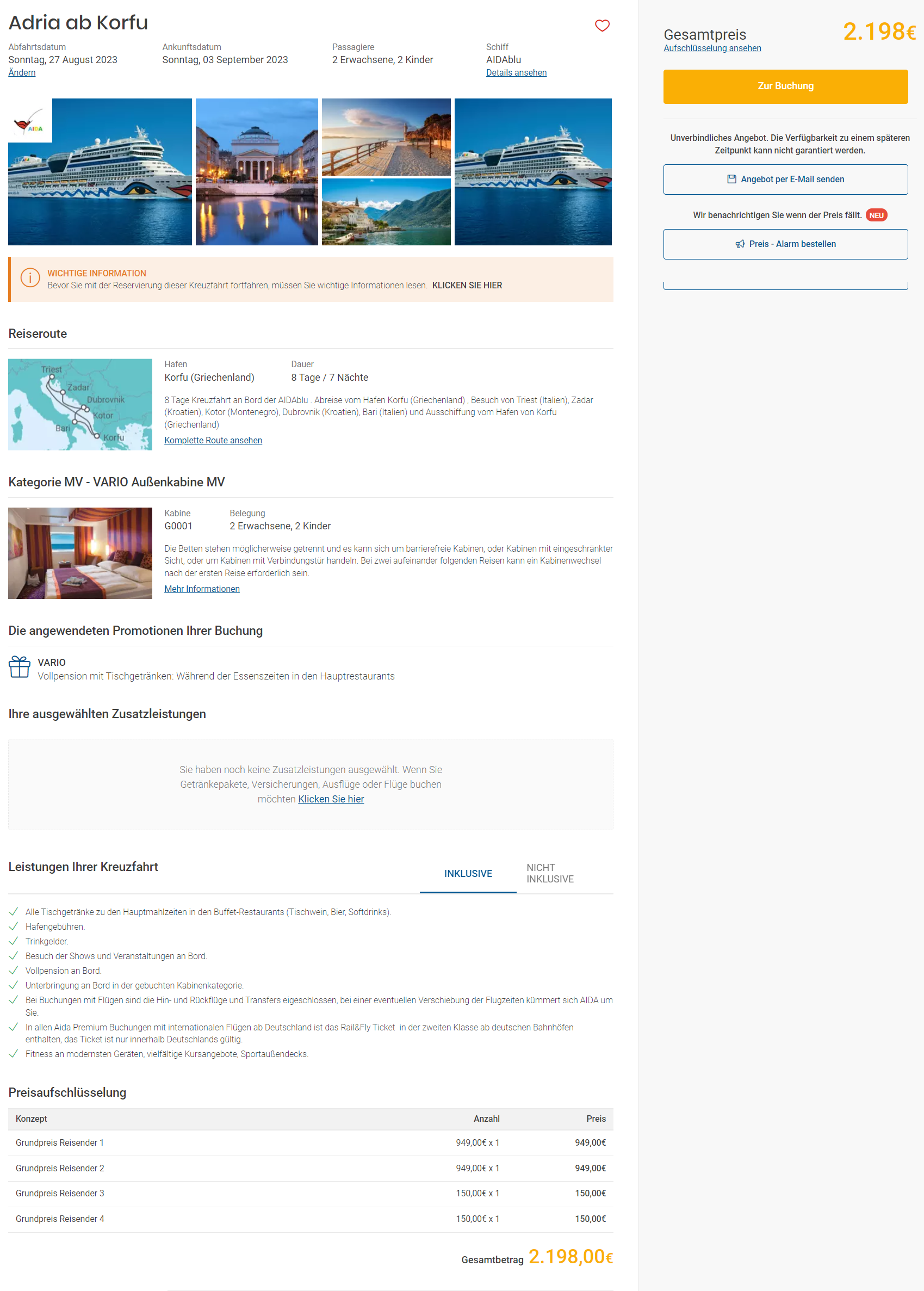 Za 7-dniowy (27 sierpnia-3 września) rejs statkiem AIDAblu dla czterech osób (w tym dwoje dzieci do 15 roku życia) zapłacisz 2198 EUR (ok. 9764 PLN). W cenę wliczone jest zakwaterowanie w 4-osobowej kajucie z oknem (pod którym znajduje się sofa) z łazienką, opłaty portowe, napiwki oraz wyżywienie w formie all inclusive w restauracjach bufetowych. Napoje bezalkoholowe (woda, kawa, soki oraz napoje gazowane) dostępne są cały czas, piwo oraz wino do obiadu i kolacji.