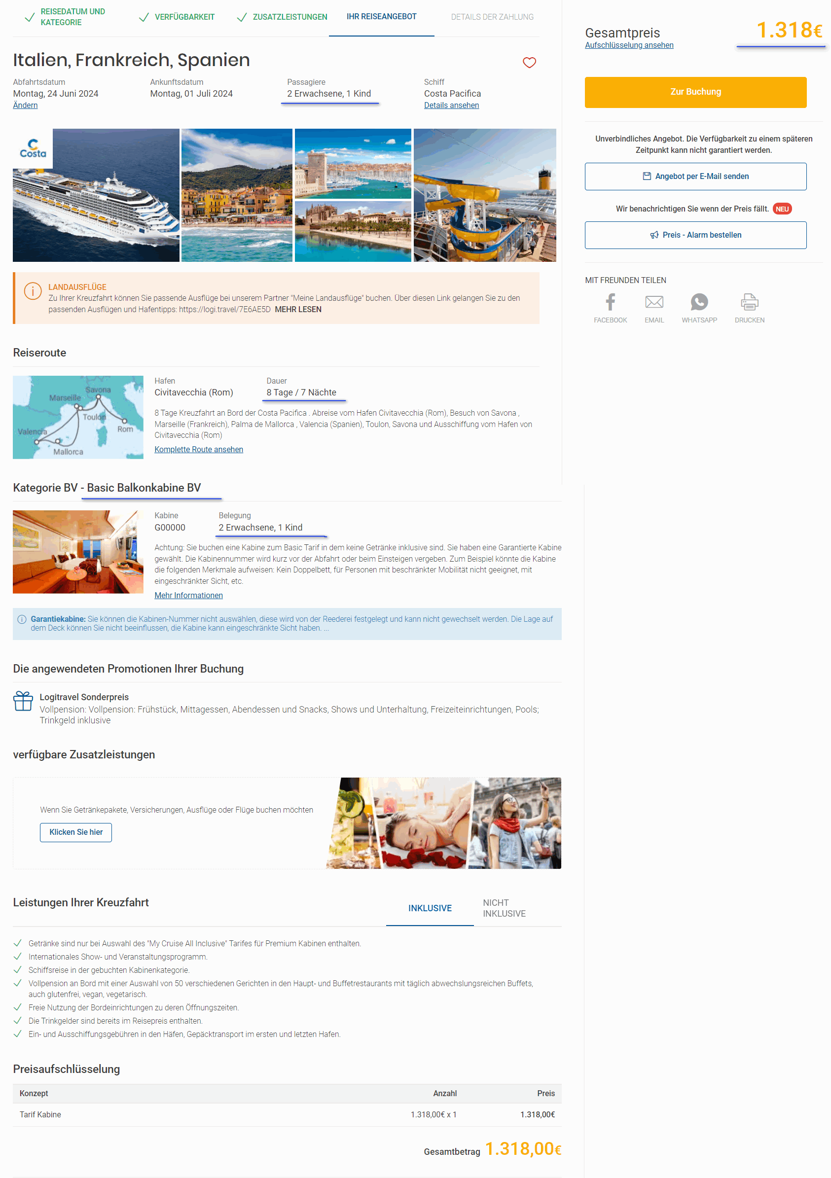 Za rejs w terminie 24 czerwca-1 lipca statkiem Costa Pacifica po basenie Morza Śródziemnego zapłacisz 1318 EUR/3 osoby (ok. 5681 PLN – 1894 PLN/osoba). W cenę wliczone jest zakwaterowanie w 3-osobowej kajucie z balkonem, łazienką, opłaty portowe, napiwki oraz wyżywienie w formule all inclusive.