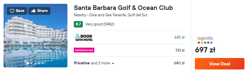 Na Teneryfie rekomenduję ci noclegi w kompleksie Santa Barbara Golf & Ocean Club, który znajduje się w odległości 100 metrów, od plaży, na południowym wybrzeżu wyspy. Na terenie obiektu są dwa odkryte baseny oraz centrum fitness.