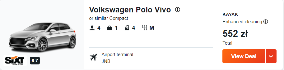 Także po przylocie do Johannesburga rekomenduję wam wypożyczyć samochód, dzięki temu łatwo, szybko i wygodnie dojedziecie do Parku Krugera. Ceny wynajmu Volkswagenena Polo (lub podobnego auta) zaczynają się już od 138 PLN/doba. Nie martwcie się jego wielkością, gwarantuję wam, że wystarczy do poruszania się po parku.