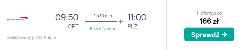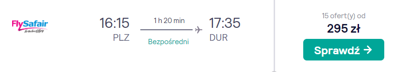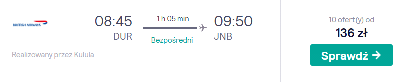Natomiast każdy z trzech lotów krajowych w RPA (Kapsztad-Port Elizabeth, Port Elizabeth-Durban oraz Durban-Johannesburg) odbędziecie bezpośrednio na pokładzie samolotu linii Kulula Airlines lub FlySafair. W cenie biletu zabrać ze sobą możecie bagaż podręczny oraz jeden przedmiot osobisty (mały plecak lub damską torebkę).