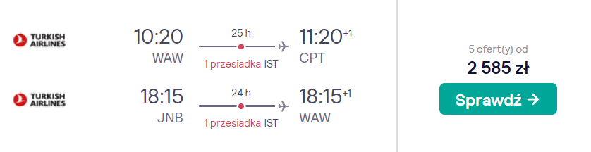 Do Republiki Południowej Afryki udacie się na początku października (2-18.10). Główną konstrukcją podróży są przeloty z warszawskiego lotniska do Kapsztadu i powrotne z Johannesburga do stolicy Polski – obie trasy pokonacie na pokładach samolotów linii Turkish Airlines, która jest dobrze oceniana przez naszych czytelników, a po drodze czekać was będą 12-godzinne przesiadki w Stambule.