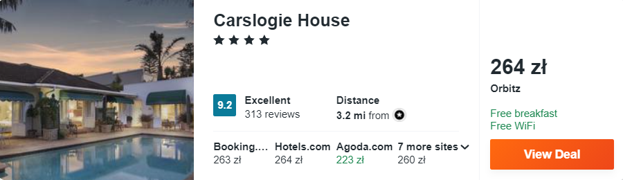 Dowiedzcie się więcej o tym hoteluW Port Elizabeth rekomenduję wam noclegi z codziennymi śniadaniami w 4* Carslogie House, który znajduje się w odległości 800 metrów od plaży Kings. Wszystkie dwuosobowe pokoje zostały gustownie urządzone i wyposażone m.in.: w klimatyzację czy telewizor LCD.