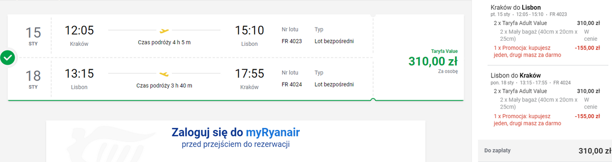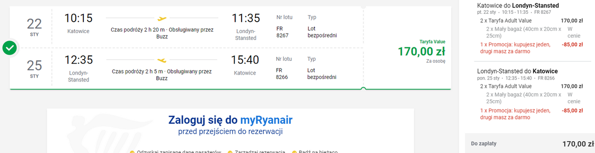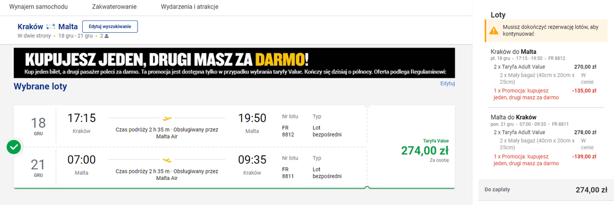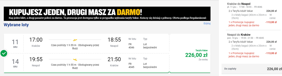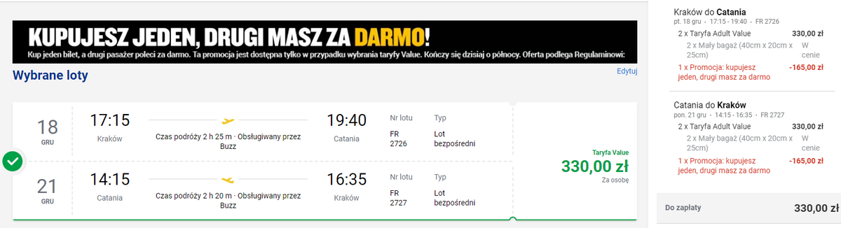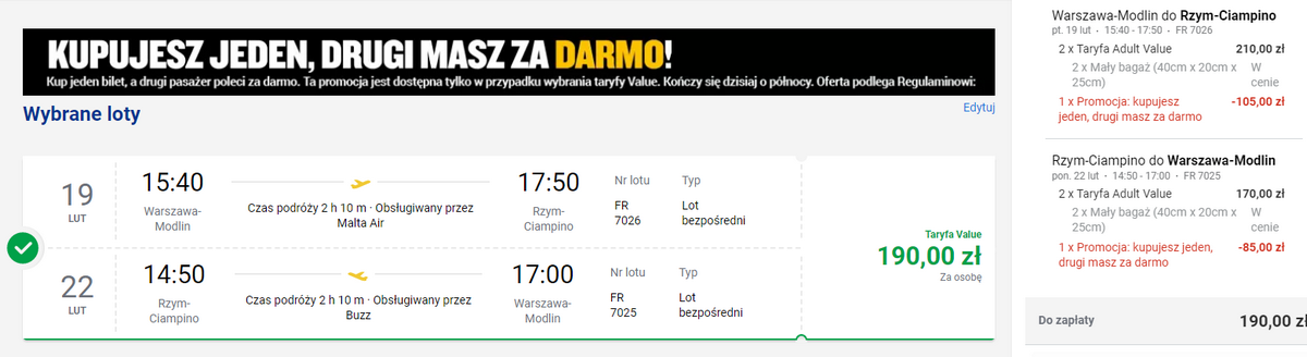 - Kupując jeden bilet w taryfie Value, drugi na ten sam lot otrzymasz za darmo.