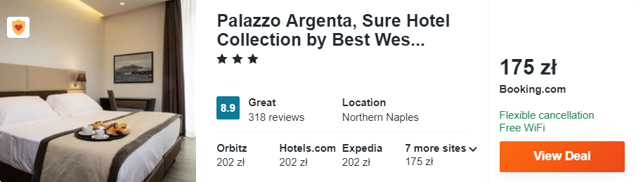 Dowiedzcie się więcej o tym hoteluW Neapolu proponuję wam zatrzymać się w 3* Palazzo Argenta Sure Hotel Collection by Best Western, który znajduje się w dzielnicy Capodichino. Do takich atrakcji miasta jak: Museo e Real Bosco di Capodimonte oraz Katakumby św. Gennaro dotrzecie z hotelu w kilkanaście minut spacerem.