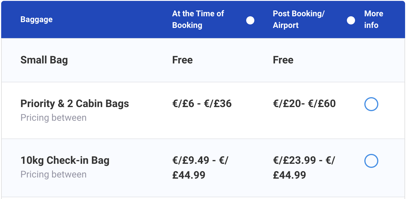Tak jak inne tanie linie, Ryanair stosuje w przypadku wszelkiego rodzaju dodatkowych opłat widełki cenowe, gdzie cena za daną usługę jest uzależniona od popytu, daty wylotu czy czasu trwania naszego połączenia. Jeśli nie chcemy podróżować z małym plecakiem, najtańszą metodą na zwiększenie swojego limitu bagażowego jest wykupienie priority boarding, czyli pierwszeństwa wejścia na pokład, w ramach którego możemy zabrać ze sobą dodatkowo 10-kilogramowy bagaż podręczny. Cena tej usługi waha się między 6 a 36 euro, w zależności od szeregu czynników. Ceny te obowiązują jednak tylko w momencie rezerwacji biletu.