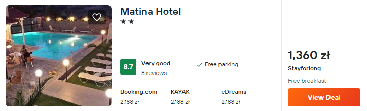 Zatrzymaj się w bardzo dobrze ocenianym hotelu Matina. Obiekt znajduje się w odległości krótkiego spaceru od plaży, a dla gości przygotowano odkryty basen oraz śniadania wliczone w cenę pobytu.
