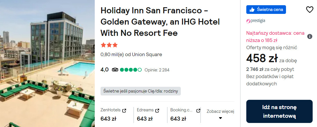 Możesz także rozważyć pobyt w 3* hotelu Holiday Inn z basenem na dachu. Obiekt znajduje się w pobliżu mostu Golden Gate i placu Union Square. We wszystkich pomieszczeniach będziesz mieć zapewniony dostęp do sieci WiFi.