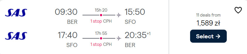 Do San Francisco udasz się z berlińskiego portu lotniczego im. Willy’ego Brandta w kwietniu. W obie strony polecisz na pokładach samolotów linii Scandinavian Airlines System z wygodnymi przesiadkami w Kopenhadze. Na wycieczkę bez dodatkowych kosztów udasz się z bagażem podręcznym o standardowych rozmiarach oraz przedmiotem osobistym.