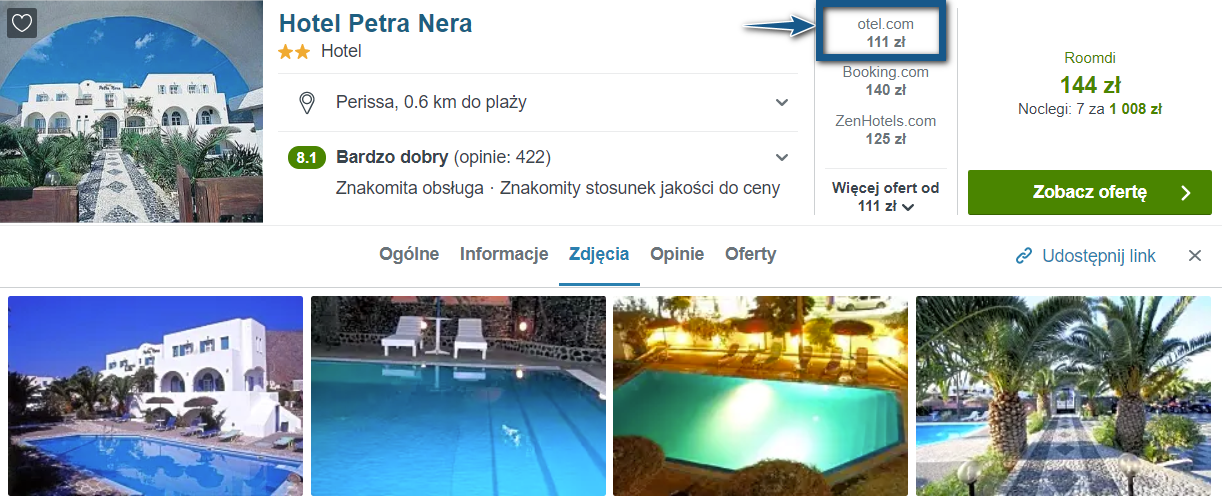 Na Santorynie proponuję wam zakwaterowanie w hotelu Petra Nera. Najniższą cenę za pobyt uzyskacie wybierając z listy pośredników otel.com