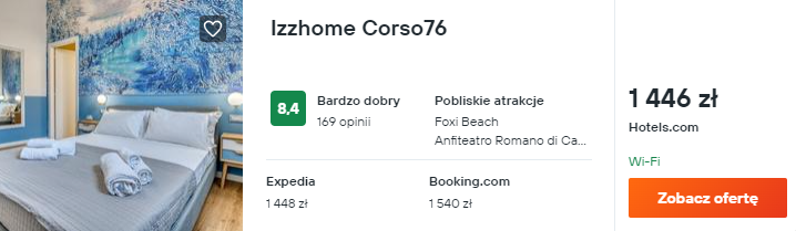 Wybrałem dla was zakwaterowanie w bardzo dobrze ocenianym pensjonacie Izzhome Corso76. Znajduje się on w centrum miasta i będzie dobrą bazą wypadową dla pieszego odkrywania atrakcji miasta.
