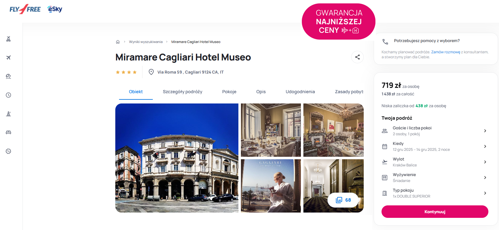 Na Sardynii zatrzymasz się w 4* Miramare Cagliari Hotel Museo – wyjątkowym obiekcie łączącym funkcje hotelu i muzeum. Goście chwalą dogodną lokalizację w samym centrum miasta, zaledwie minutę od portu i 13 minut od popularnej plaży Poetto. Hotel oferuje eleganckie pokoje i możliwość wypożyczenia rowerów, co ułatwia zwiedzanie miasta. Na dobry początek dnia otrzymasz pyszne śniadanie wliczone w cenę pobytu.