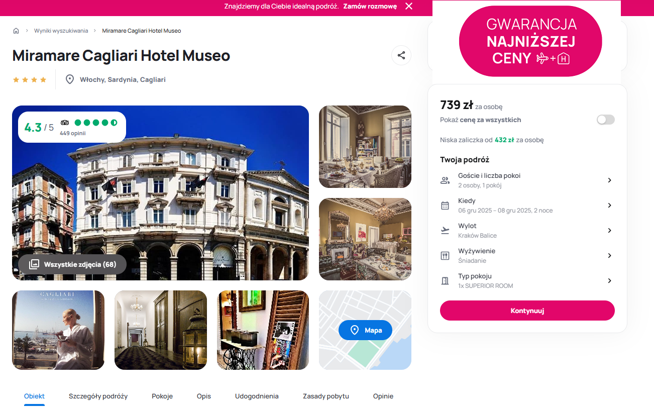 🛏️ Zakwaterowanie: 4* hotel Miramare Cagliari