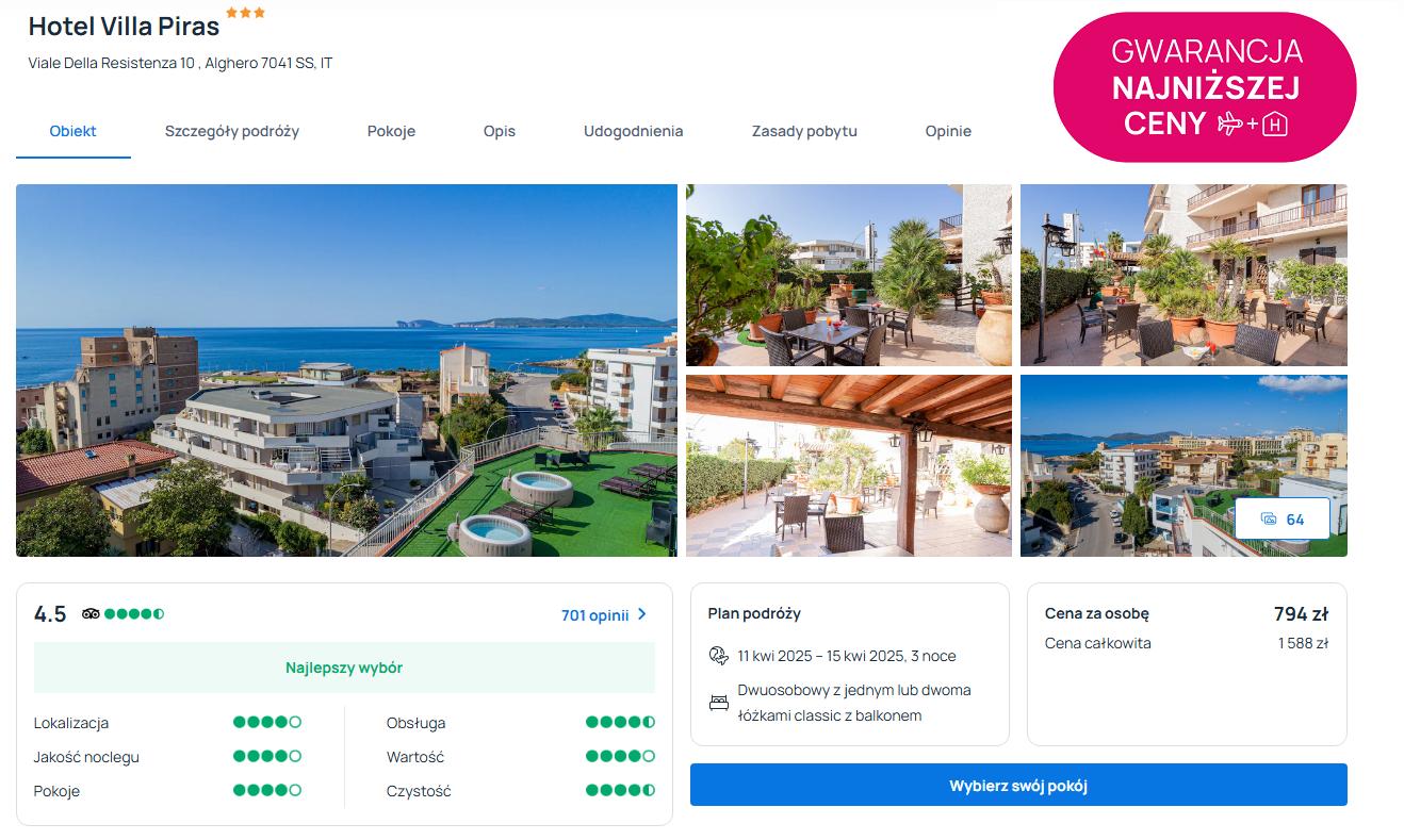 Zatrzymasz się w bardzo dobrze ocenianym 3* hotelu Villa Piras. Obiekt oferuje dogodną lokalizację w pobliżu wybrzeża, komfortowo urządzone pokoje oraz jacuzzi na dachu budynku.
