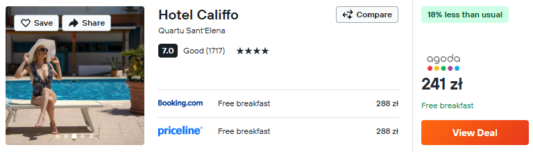 Wybrałem noclegi w 4* hotelu Califfo. Obiekt cieszy się dobrymi opiniami dotychczasowych gości i choć ma już swoje lata – oferuje bardzo dobry stosunek ceny do jakości. Na dobry początek dnia otrzymasz tam pyszne śniadanie wliczone w cenę pobytu.