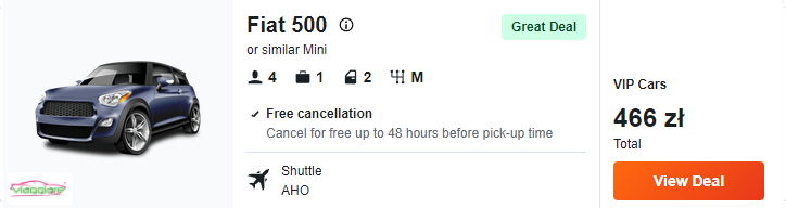 Na lotnisku w Alghero wypożyczcie samochód, który pomoże wam przemierzać okoliczne rejony. Dzięki niemu wasza podróż będzie o wiele łatwiejsza. Za tygodniowy wynajem Fiata 500 lub podobnego modelu zapłacicie w sumie 466 PLN.